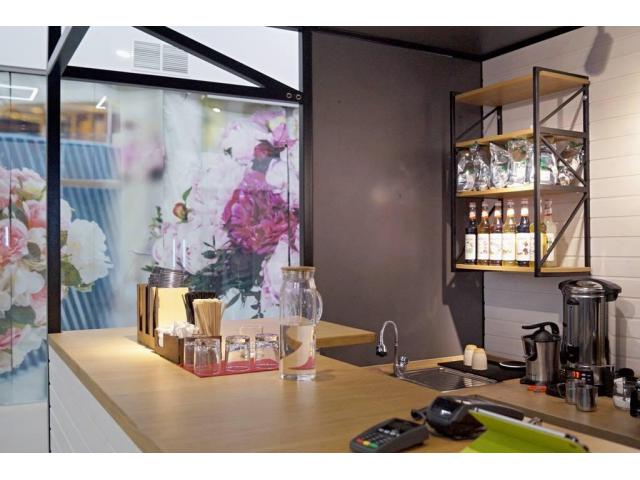 На торговый объект проведена канализация, что позволяет осуществлять выдачу напитков на месте. Для гостей оборудовано 30 мест. Есть большое количество посуды, в т.ч. Loveramics, крафтовые стаканы бокалы и тд. С торговым центром есть договоренность по уборке территории их силами.