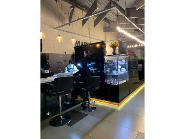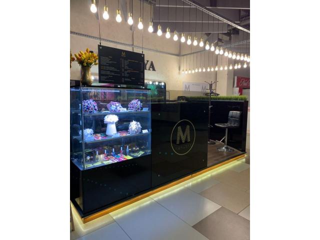 Площадь помещения составляет 16 м2. Оборудовано 3 рабочих места для бровиста/визажиста, а также 2 рабочих места для мастера по маникюру. Дизайн бьюти-бара привлекает внимание посетителей торгового центра, а профессионализм мастеров делает их постоянными клиентами.