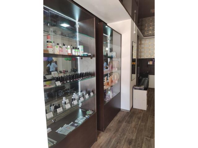 Зона отдыха для клиентов: диван, пуфик, столик журнальный, столик для чаяпития, кофеварка, витрины для продажи с подсветкой, уходы для продажи.